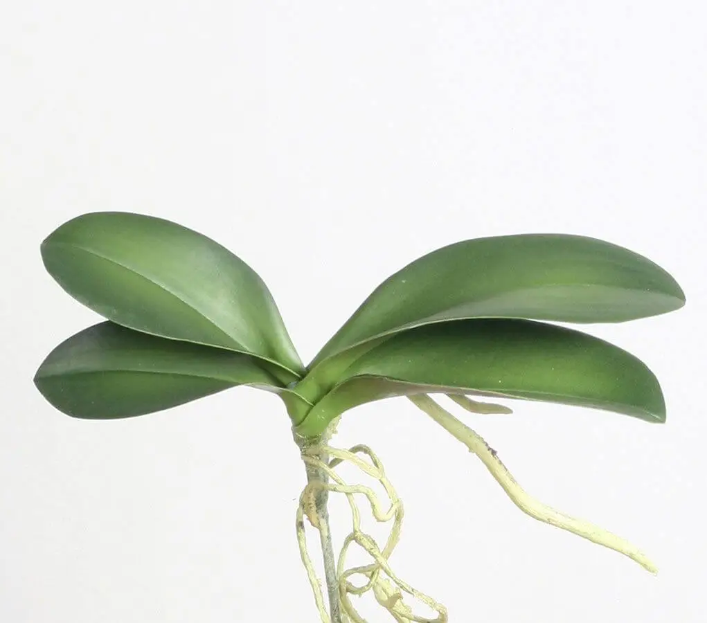 Orkidéblad, konstgjort, 20 cm. Mörkgröna hårda blad med sidenmatt lyster. Lite prickar och skav här och när för en ännu naturligare look. Några silvergröna luftrötter.